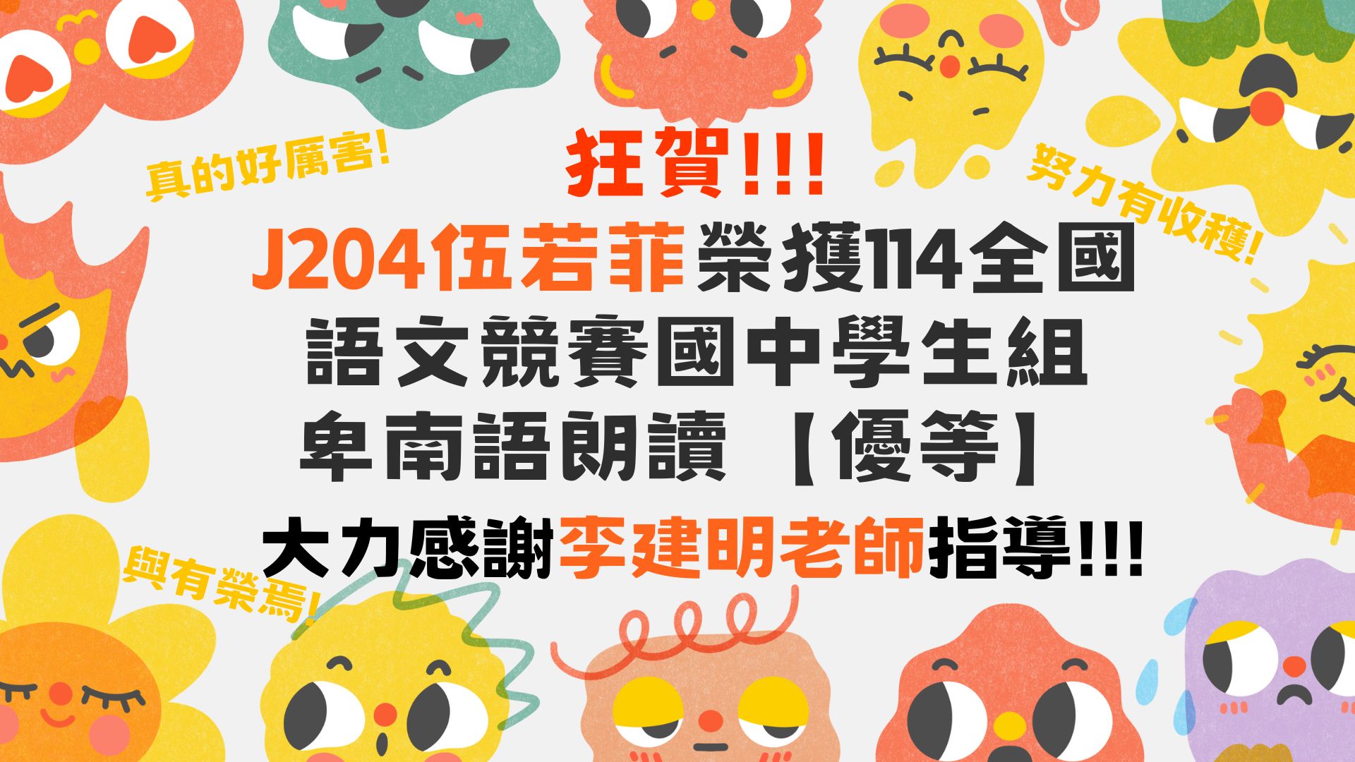 狂賀!!! J204伍若菲榮獲114全國 語文競賽國中學生組卑南語朗讀優等!