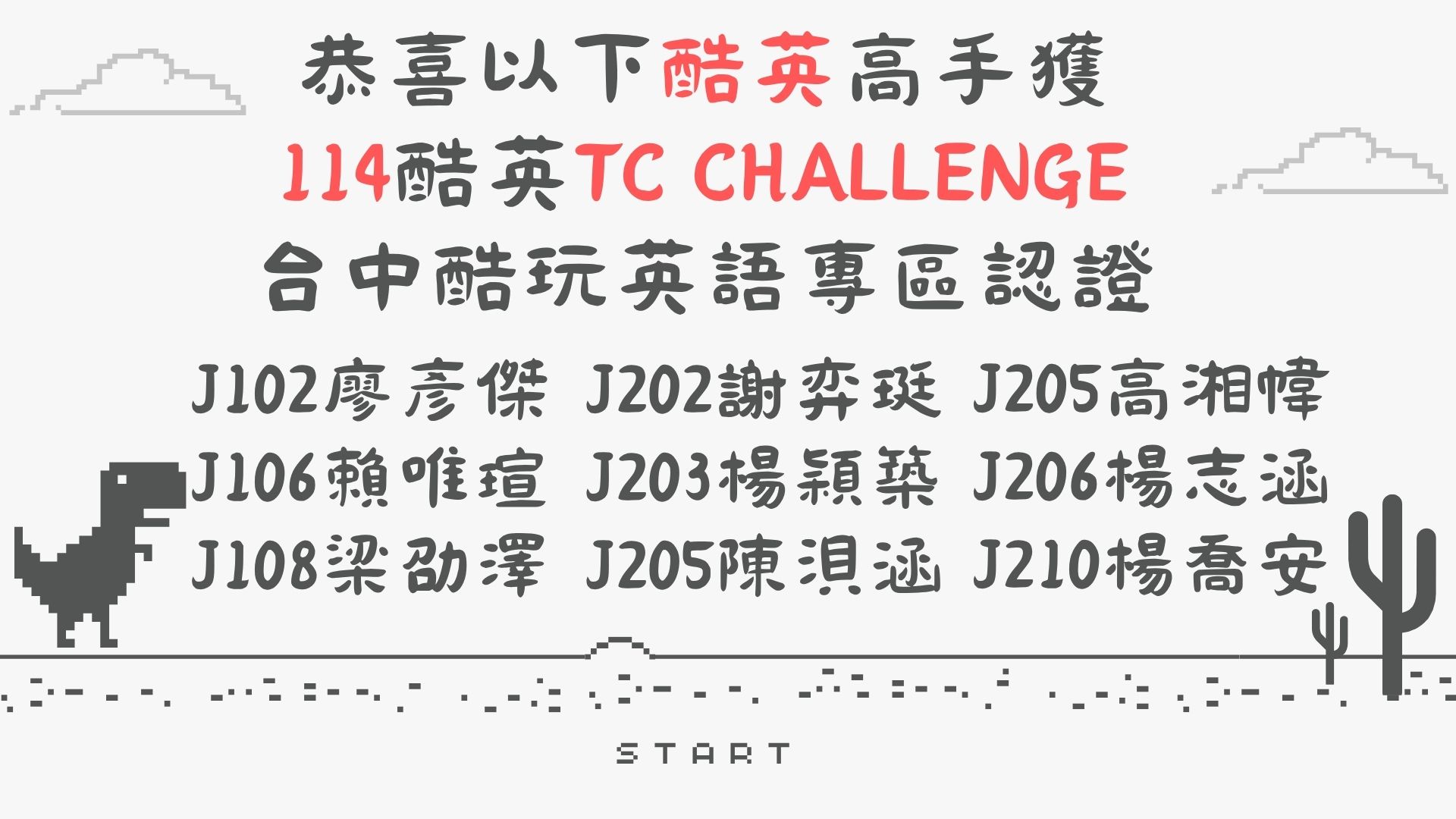 恭喜國中部酷英高手獲114酷英tc challenge台中酷玩英語專區認證