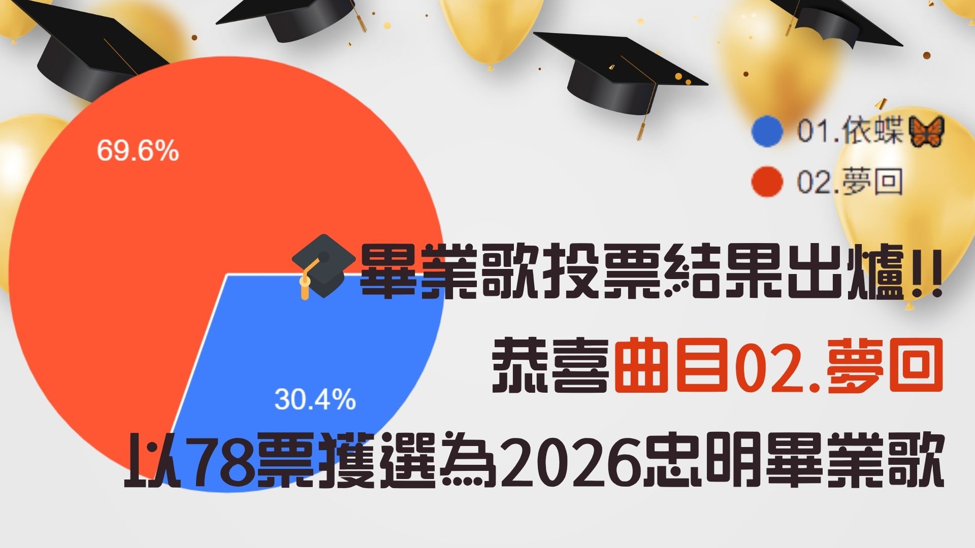 恭喜H303洪芷嫻同學創作的歌曲──〈夢回〉以78票成功獲選為本校2026年度畢業歌🎉🎉