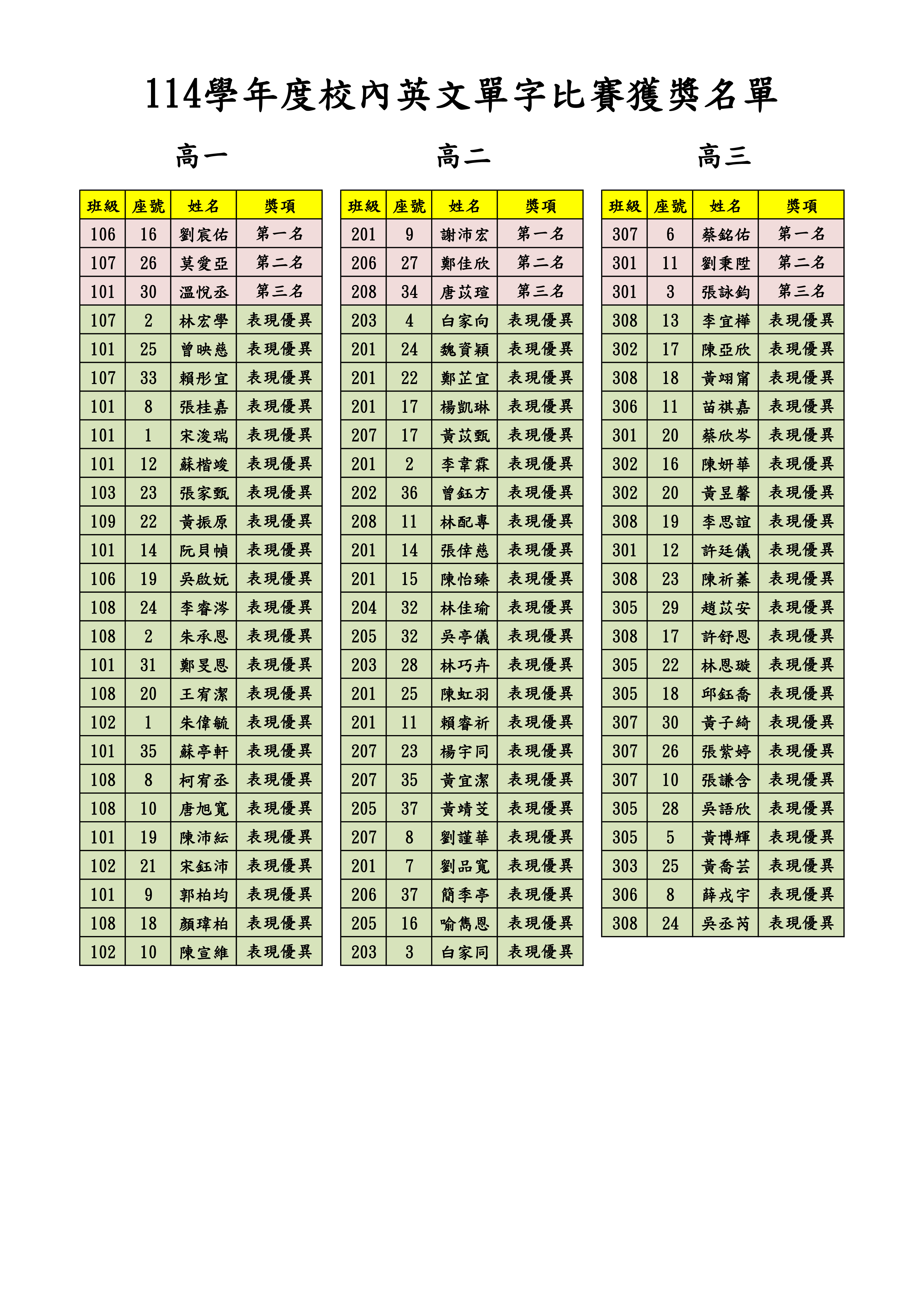 114學年度 校內英文單字比賽 獲獎名單
